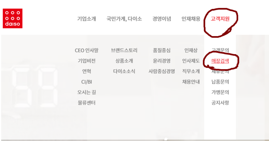 다이소 몰이 아닌 다이소 사이트입니다. 사이트에 들어가서 맨 오른쪽에 고객지원 매장검색에 들어갑니다. 위치정보에 동의했다면 주변의 매장을 쉽게 찾을 수 있을 겁니다. 간단히 구, 동 만 알아도 검색해 볼 수 있습니다.
